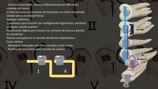 - Caninos impactados, manejo tridimensional con diferentes sistemas de fuerzaI. - Errores comunes al momento de traccionar un canino impactado. - Unidad activa vs Unidad Pasiva. - Anclajes indirectos. - Cantilevers para tracción con configuración logarítmica, armónica y v-bend, cuando usarlas? - Planificación digital para conocer los vectores de fuerza y diseñar las mecánicas. - Nuevos conceptos en la tracción de dientes impactadnos. - Casos clínicos. - Mecánicas avanzadas con micro tornillos y mini placas. - Práctica de cantilevers para tracción de caninos.