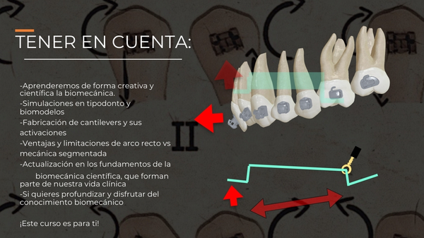 - Aprenderemos de forma creativa y científica la biomecánica. - Simulaciones en tipodonto y biomodelos. - Fabricación de cantilevers y sus activaciones. - Ventajas y limitaciones de arco recto vs mecánica segmentada. - Actualización en los fundamentos de la biomecánica científica, que forman parte de nuestra vida clínica. - Si quieres profundizar y disfrutar del conocimiento biomecánico ¡Este curso es para ti!