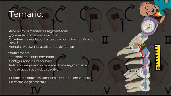 - Arco recto vs mecánicas segmentadas. - ¿Que es la biomecánica racional. - Ortodoncia guiada por l a fuerza o por la forma… Cuál es mejor? - Ventajas y desventajas Sistemas de fuerzas estáticamente determinado e indeterminados. - Configuración de cantilevers. - Indicaciones para el uso de mecánica segmentadas. - Unidad activa vs unidad reactiva. - Práctica de dobleces compensatorio para crear anclaje. - Ejercicios de geometrías